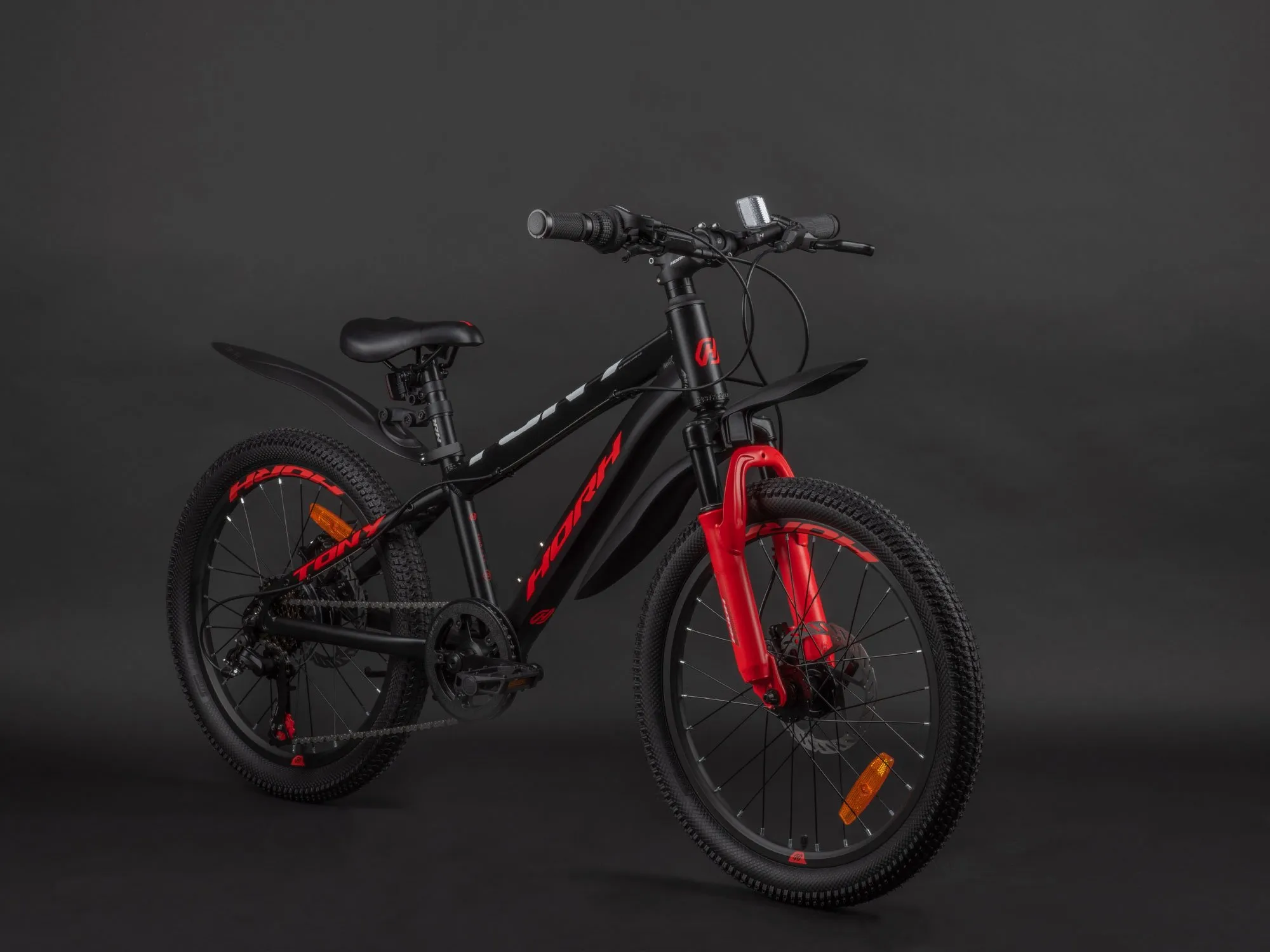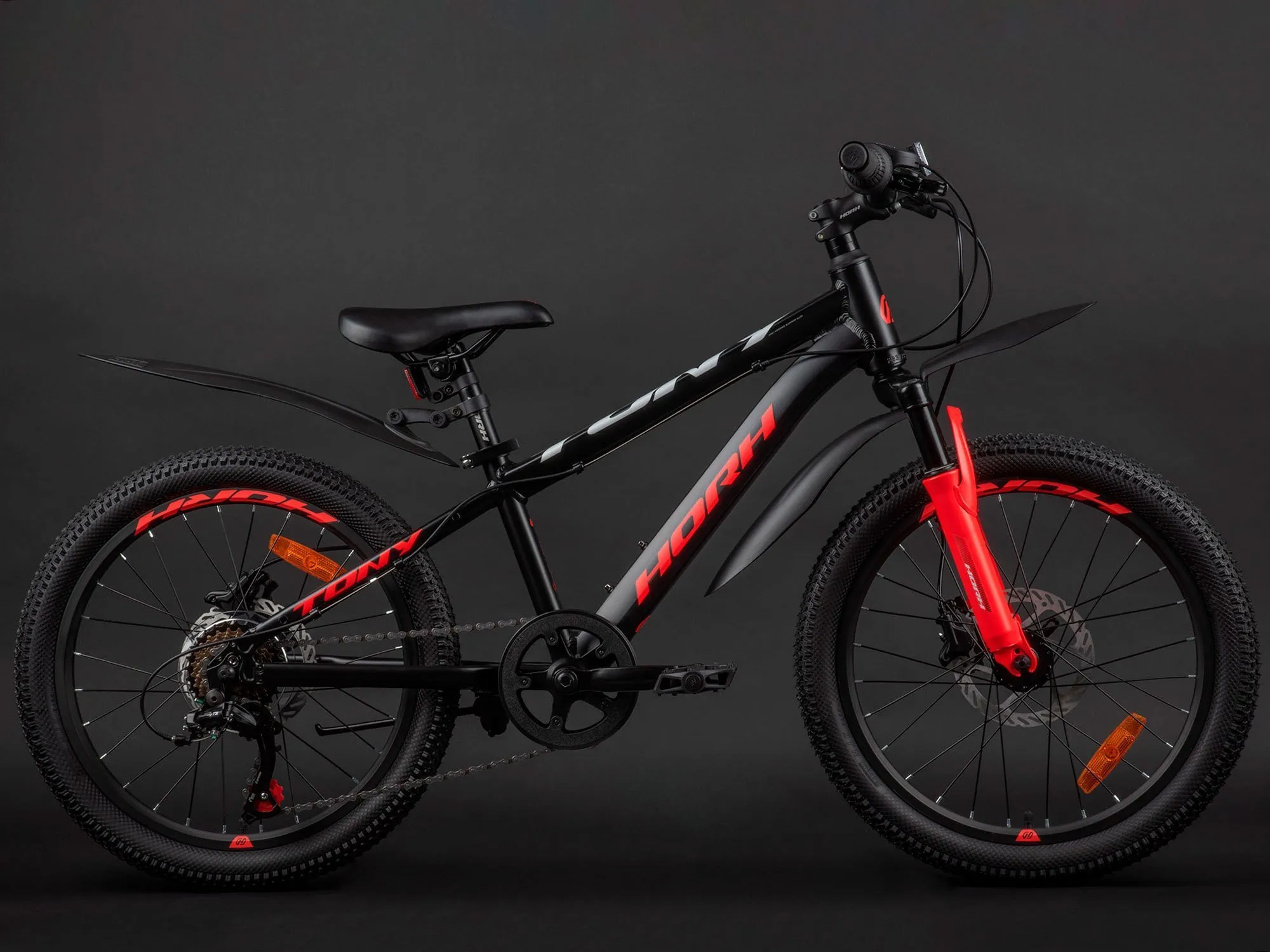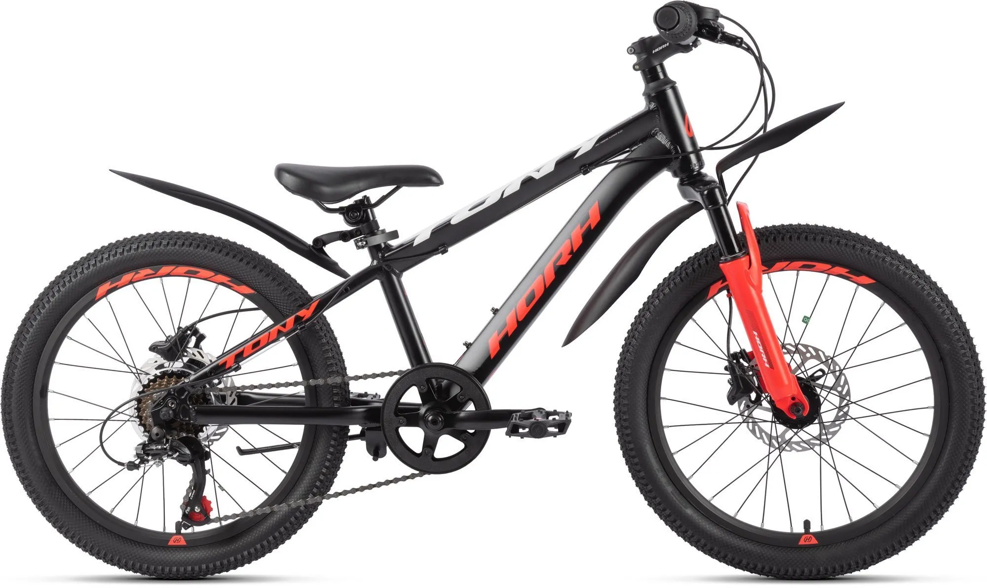 Horh Tony – не просто детский велосипед, а самый настоящий хардтейл для юного райдера! У данной модели есть оборудование Shimano Tourney и манетки Shimano Revoshift, рассчитанные на переключение 7 скорости, амортизационная вилка с ходом 80 мм, надёжные дисковые гидравлические тормоза и подножка для удобства парковки где угодно.