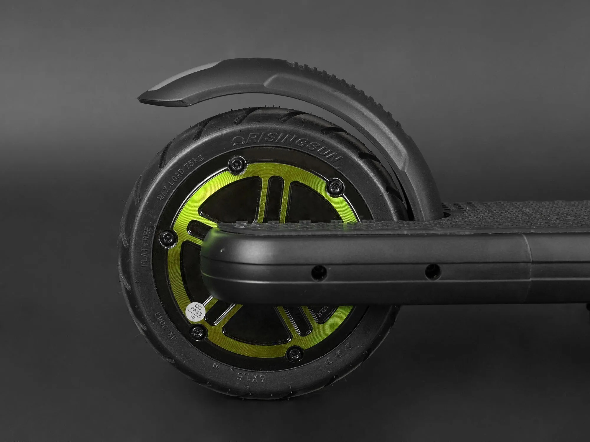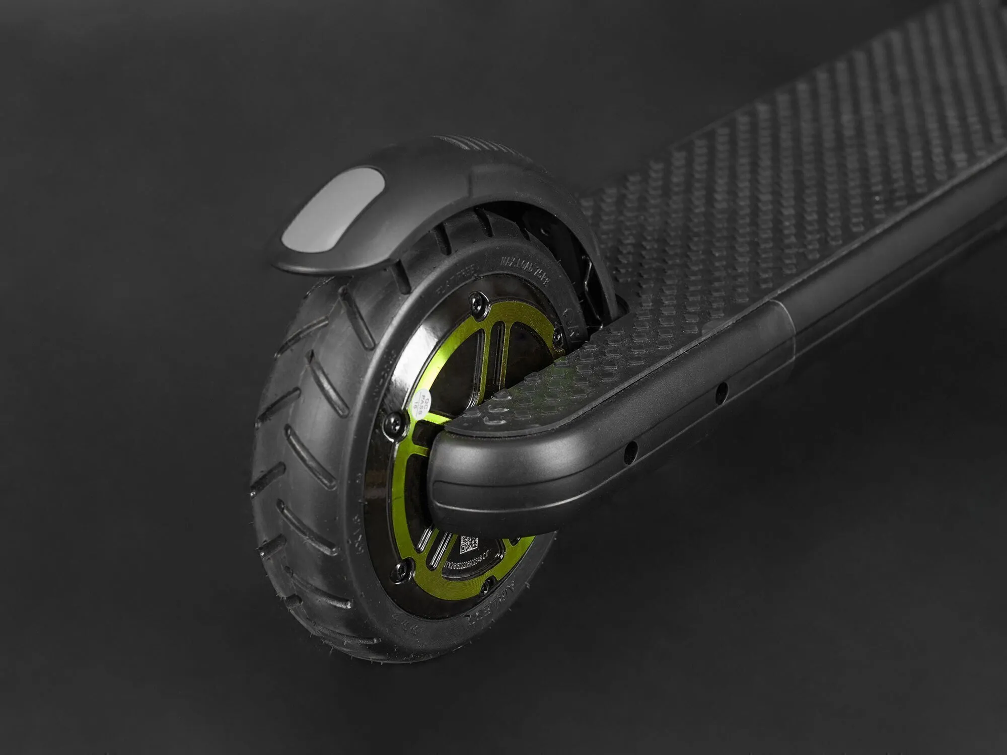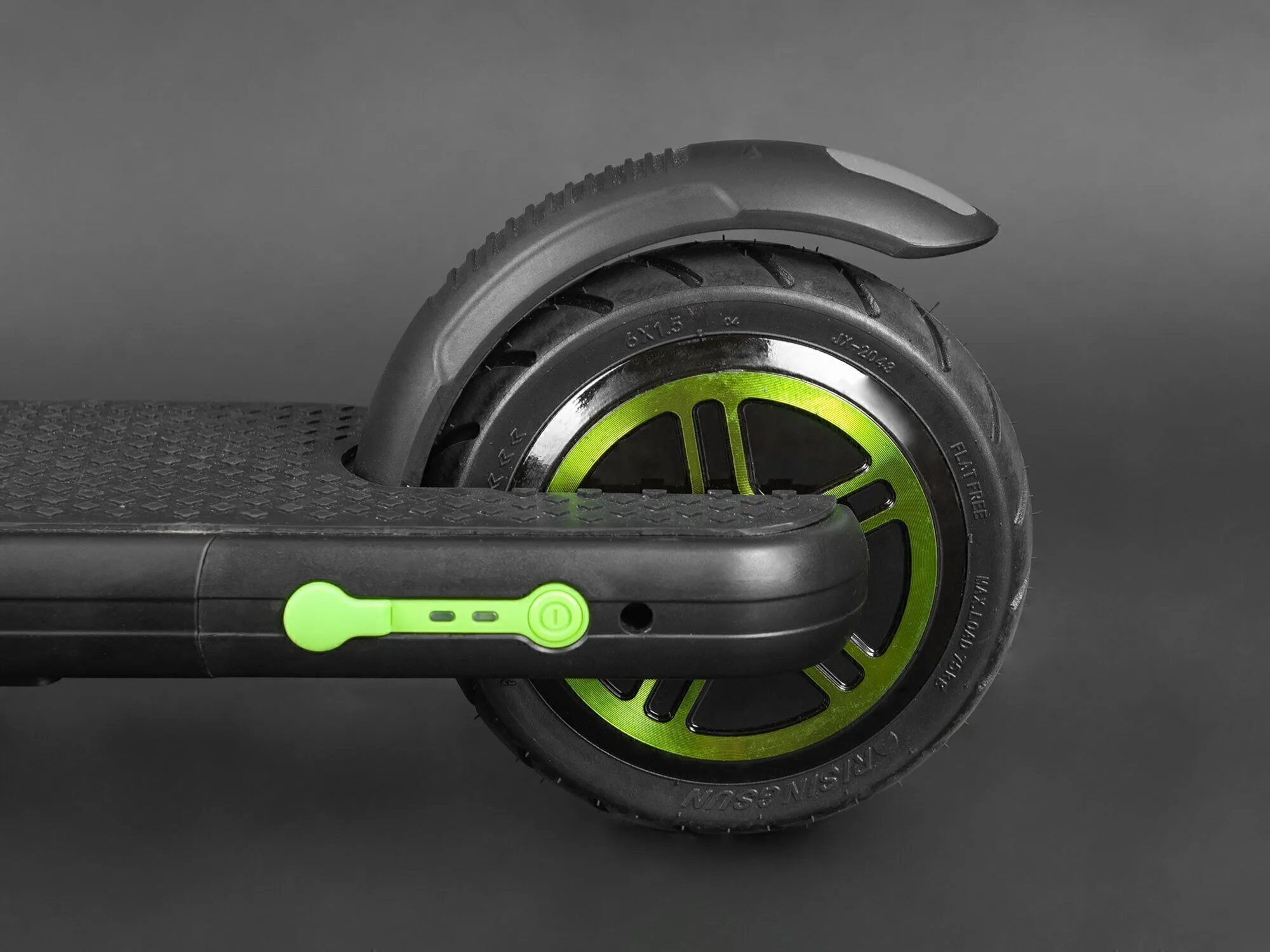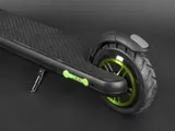 Переднее колесо сделано из особо прочного материала, на заднем колесе размещены мотор и резиновый задний тормоз. Для запуска мотора достаточно всего лишь нажать на педаль, которая расположена на передней части деки. Колёса обладают прекрасным накатом и уверенно держат дорогу.