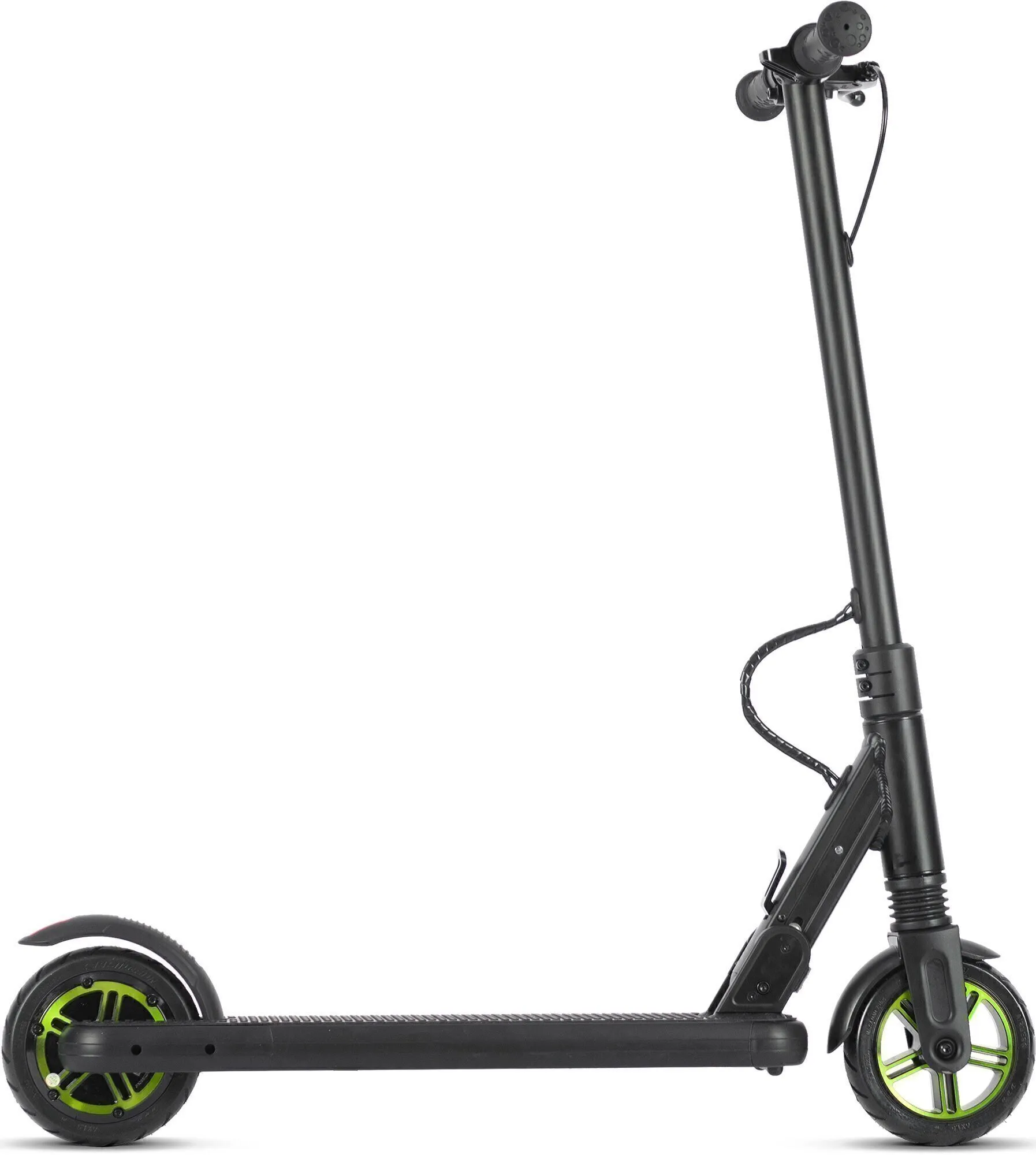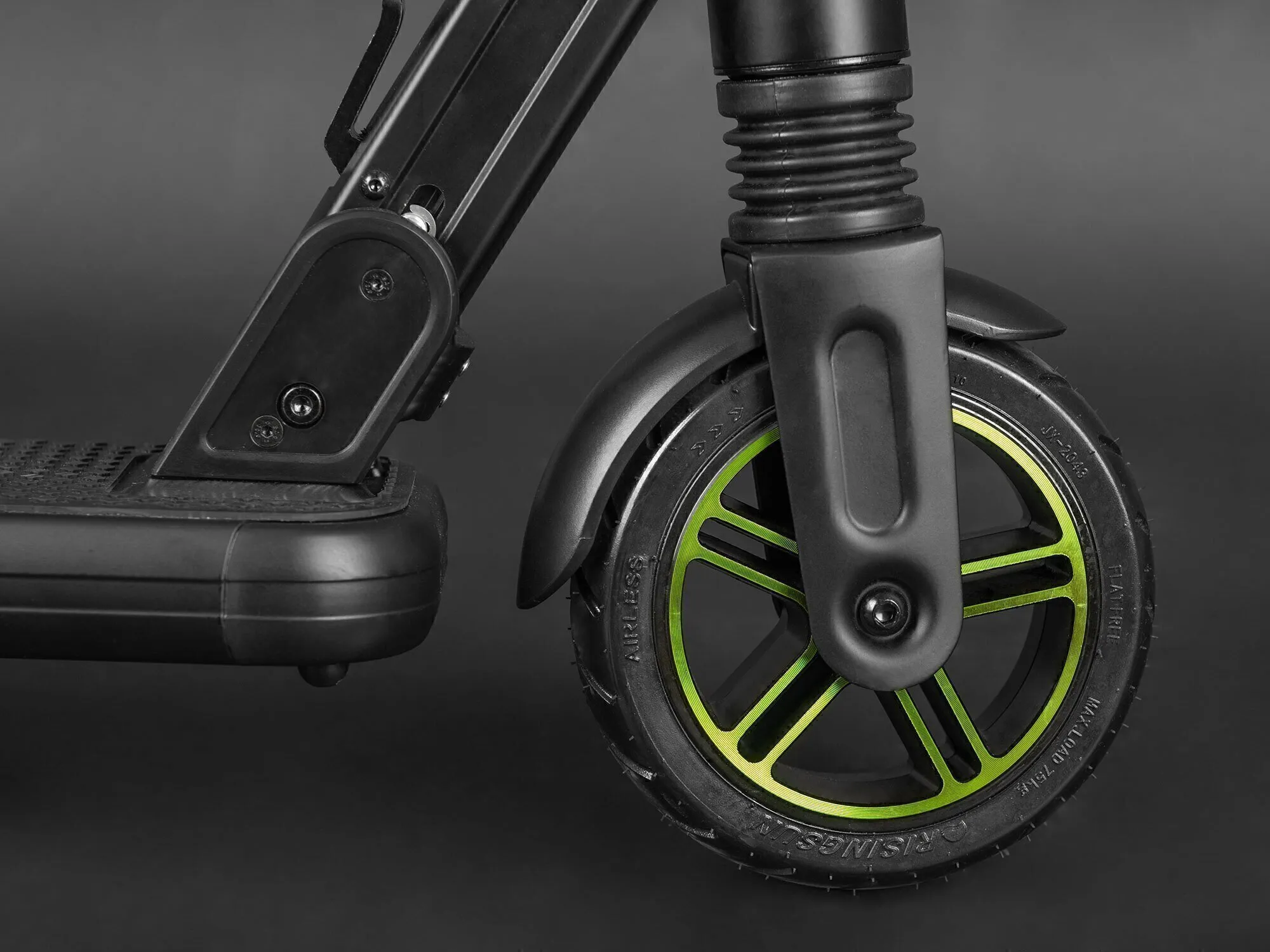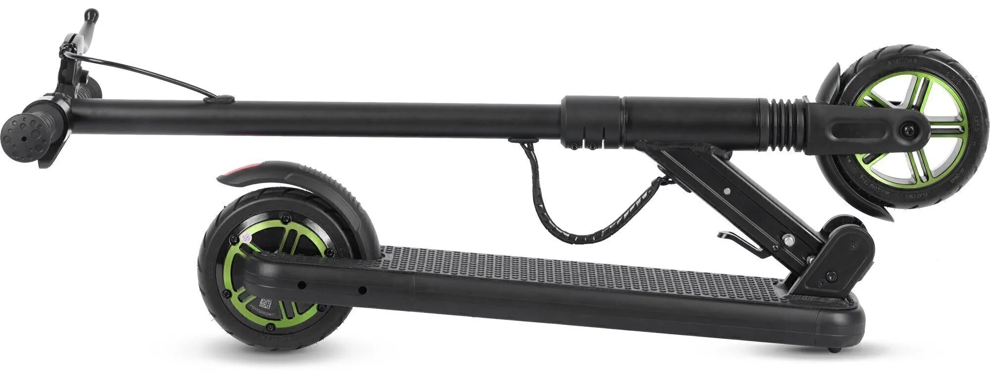 Переднее колесо сделано из особо прочного материала, на заднем колесе размещены мотор и резиновый задний тормоз. Для запуска мотора достаточно всего лишь нажать на педаль, которая расположена на передней части деки. Колёса обладают прекрасным накатом и уверенно держат дорогу.
