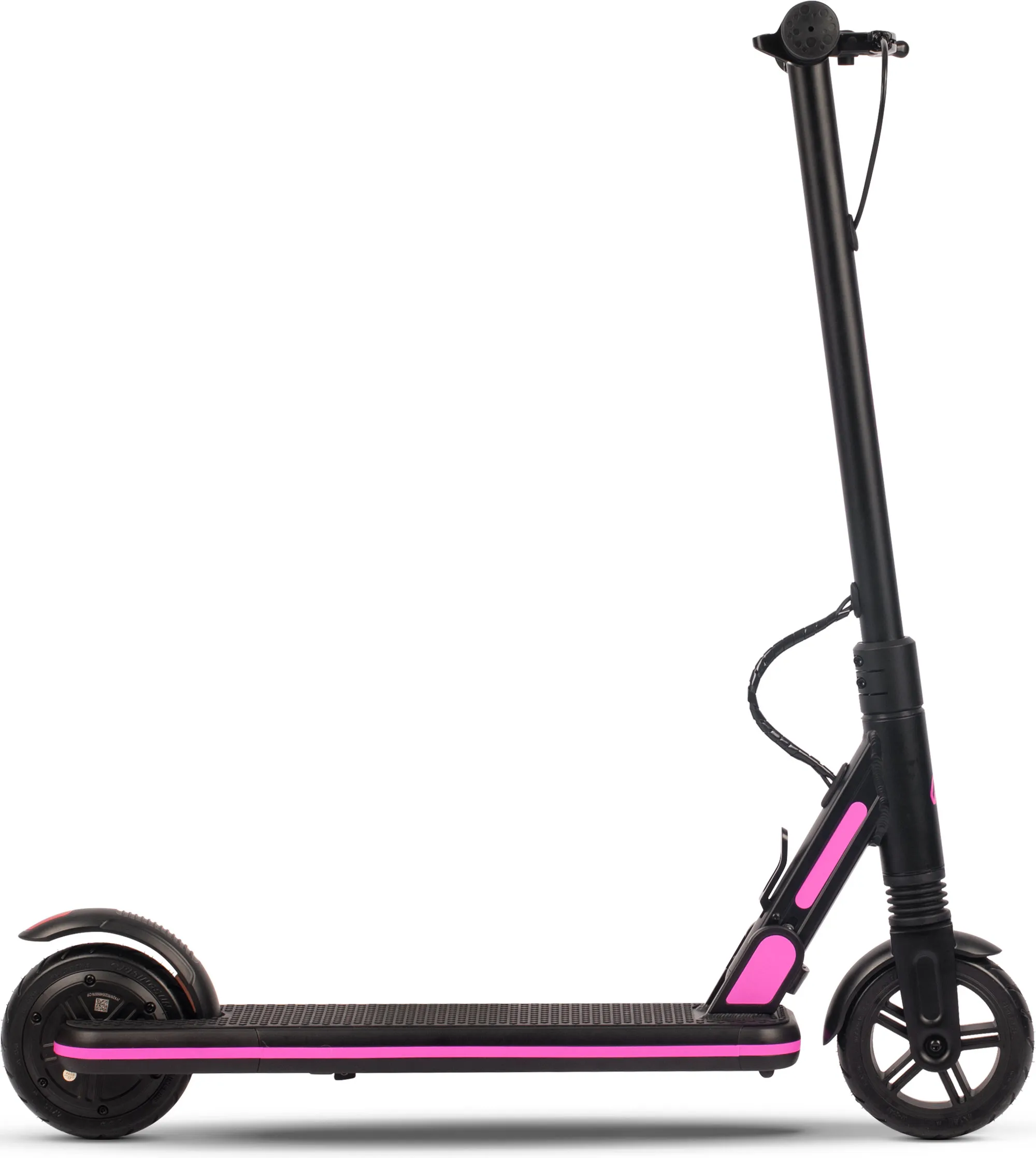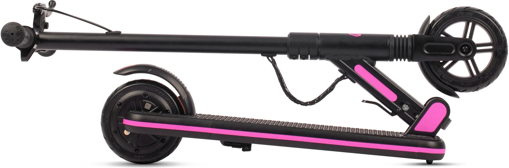 Переднее колесо сделано из особо прочного материала, на заднем колесе размещены мотор и резиновый задний тормоз. Для запуска мотора достаточно встать на самокат, оттолкнуться и нажать на курок газа, которая расположен на руле. Колёса обладают прекрасным накатом и уверенно держат дорогу.